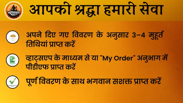 अपना मुहूर्त प्राप्त करें: 48-72 घंटों के भीतर, आपको पीडीएफ प्रारूप में एक विस्तृत मुहूर्त प्राप्त होगा, जो सीधे आपके व्हाट्सएप, ईमेल या अन्य पसंदीदा चैनलों पर भेजा जाएगा।