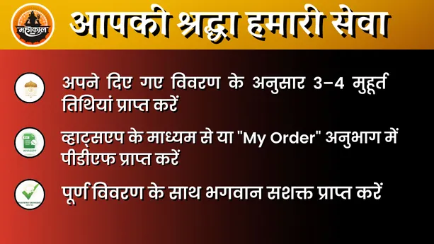 अपना मुहूर्त प्राप्त करें: 48-72 घंटों के भीतर, आपको पीडीएफ प्रारूप में एक विस्तृत मुहूर्त प्राप्त होगा, जो सीधे आपके व्हाट्सएप, ईमेल या अन्य पसंदीदा चैनलों पर भेजा जाएगा।